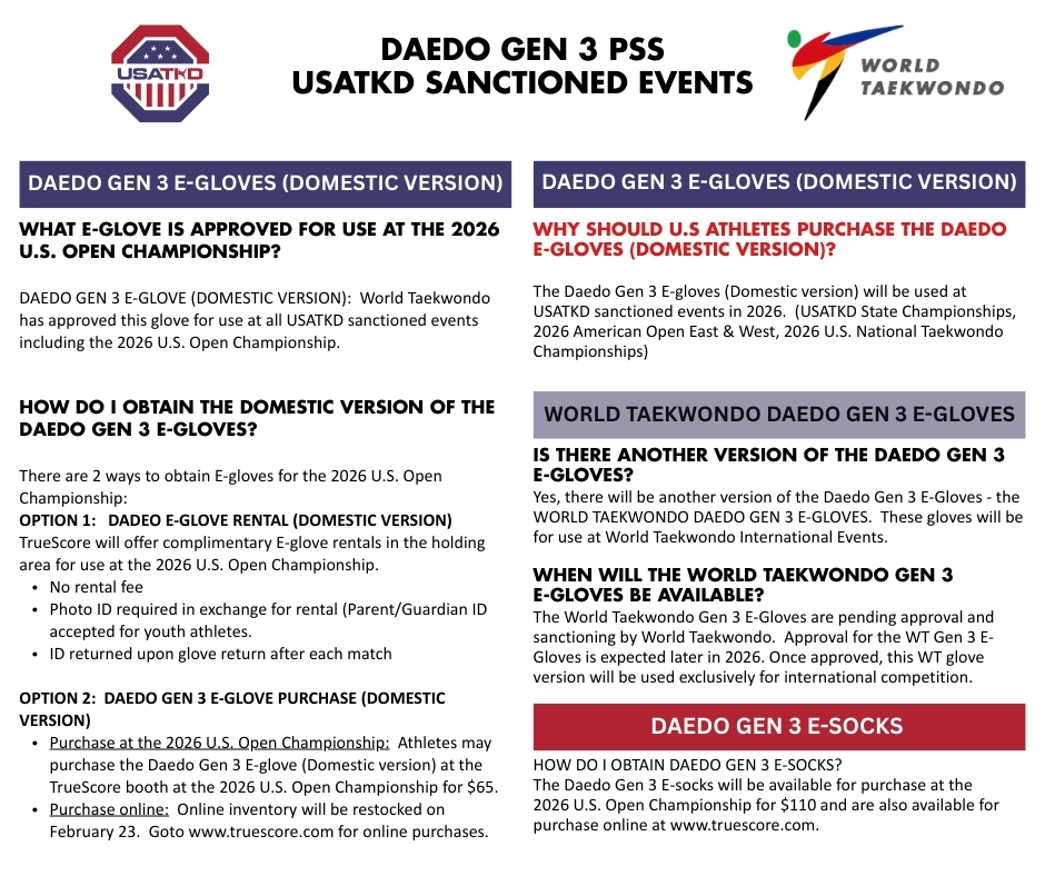 The Daedo Gen 3 PSS will be used at USATKD Sanctioned events, INCLUDING the 2026 U.S. Open Championships.